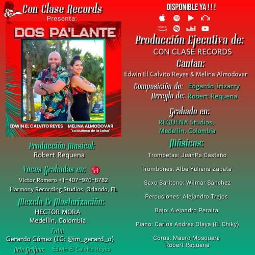 Con Clase Récords & Media nos trae al Cantautor Puertorriqueño, Edwin “El Calvito” Reyes, junto a la inigualable, Melina Almodóvar “La Muñeca de la Salsa”, con el tema, DOS PA’LANTE.