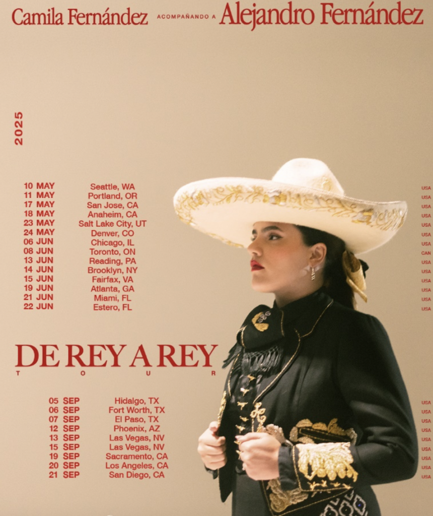 Muestra de lo anterior es su participación en la exitosa gira “De Rey A Rey”, donde comparte escenario con su padre, Alejandro Fernández, en una experiencia que ha unido distintas generaciones en torno al mariachi y la estética vernácula. A lo largo de todos los shows, Camila ha mostrado su capacidad para emocionar al público, efecto que aún se podrá disfrutar durante las últimas fechas del tour, mismas que compartimos a continuación: