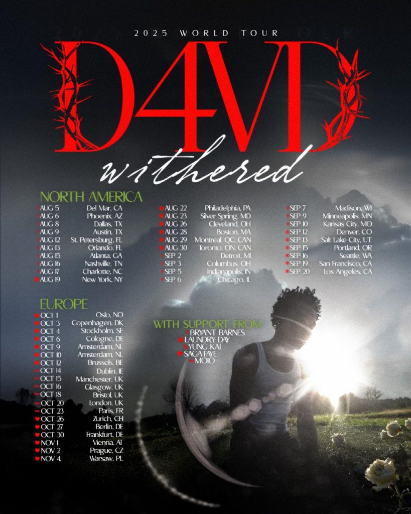 25 de abril de 2025 (Los Ángeles, CA) – El innovador artista d4vd ha lanzado su álbum debut – WITHERED – una obra de quince canciones que muestra al compositor, artista e intérprete en su mejor momento. El álbum lleva al oyente a través de la evolución natural y la vida útil de la rosa, un elemento visual omnipresente en la producción creativa de d4vd hasta la fecha, y está pensado para ser escuchado secuencialmente como los capítulos de un libro a medida que se desarrolla el final de una relación. Es un álbum en el que el amor encontrado, el amor perdido, el amor creado y el amor destruido brillan en cada estribillo y en cada línea melódica.