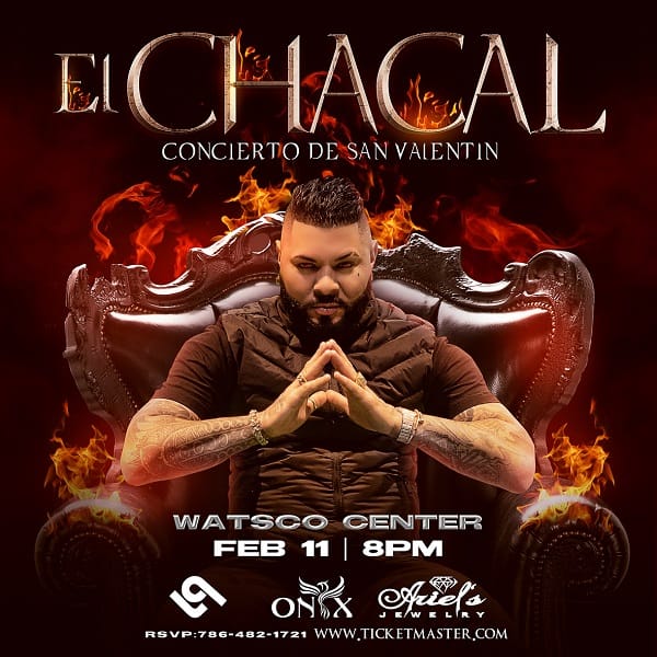 El Chacal, conocido en la industria musical como “El Demonio de la Fama”, se presenta el viernes, 11 de febrero a las 8pm en el Watsco Center de Miami, Fl. Chacal sin duda es uno de los artistas con mas energía en el escenario, siempre da lo mejor de si en sus presentaciones en vivo. Sus conciertos por lo general llenan a capacidad y esperamos que esta no sea la excepción.