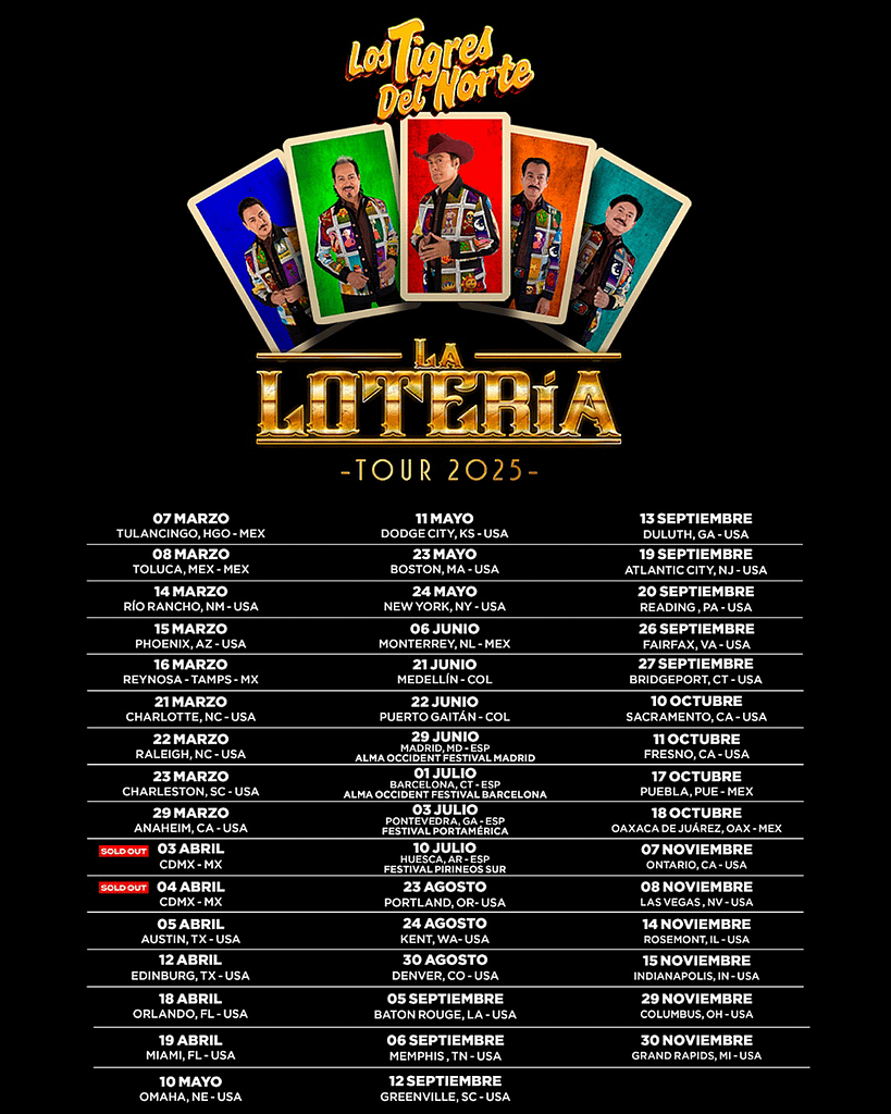 La gira “LA LOTERÍA TOUR 2025” continuará con presentaciones en Chicago, Miami, Memphis, Washington DC, Boston, Las Vegas y muchas ciudades más. Sumando las fechas ya realizadas en Estados Unidos en 2025, y las próximas visitas a México, Colombia y España, Los Tigres del Norte superarán una vez más las 50 presentaciones anuales.