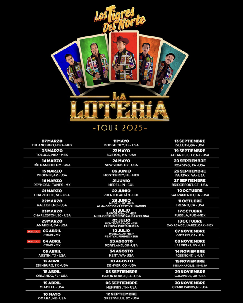 La gira “LA LOTERÍA TOUR 2025” continuará con presentaciones en Chicago, Miami, Memphis, Washington DC, Boston, Las Vegas y muchas ciudades más. Sumando las fechas ya realizadas en Estados Unidos en 2025, y las próximas visitas a México, Colombia y España, Los Tigres del Norte superarán una vez más las 50 presentaciones anuales.