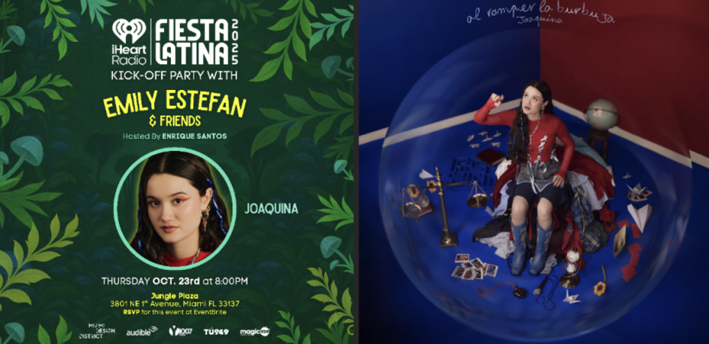 Tras pasar un mes en España, donde participará como co-coach en la temporada actual de ‘La Voz’ España junto a Malú y abrirle la gira ‘Entre Tanta Gente’ de Sebastián Yatra en Barcelona y Madrid, Joaquina está lista para presentarse en el iHeart Radio’s Fiesta Latina 2025 Kick-Off Party el 23 de octubre en Miami. Presentada por Enrique Santos, Joaquina se unirá a Emily Estefan y a otros artistas como Cimafunk, Tony Succar, Lauren Jauregui y muchos más.